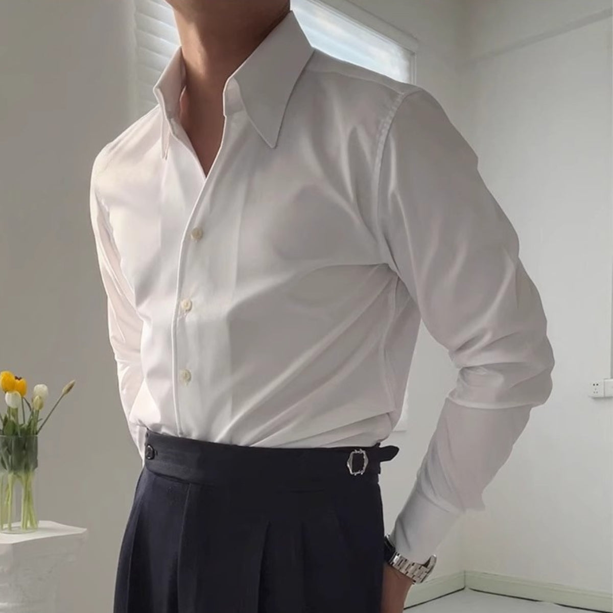 The Everett Shirt is a crisp statement in restraint. Cut from a smooth cotton blend with a dry hand, it’s meant for quiet rooms, measured words, and firm handshakes.